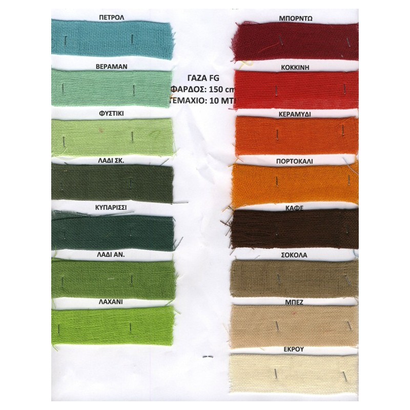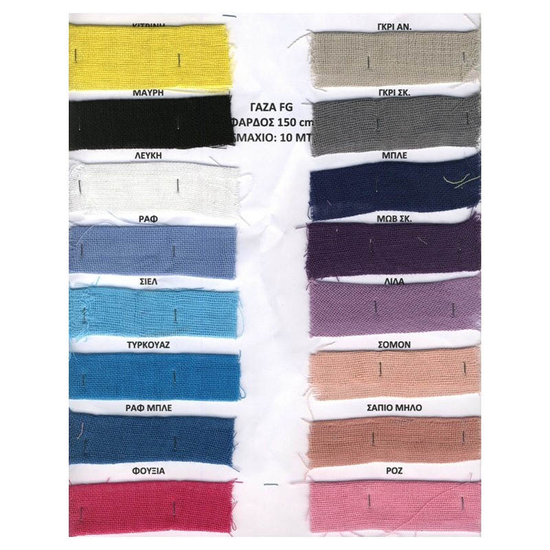 Γάζα βαμβακερή Α ποιότητα, σε διάσταση φάρδος 1,5 μέτρο. Η τιμή είναι για 5 μέτρα. Ιδανικό για στολισμό σε βάφτιση και σε γάμο. Για το χρώμα στο τέλος γράψτε το κωδικό ή καλέστε στο 2461025990