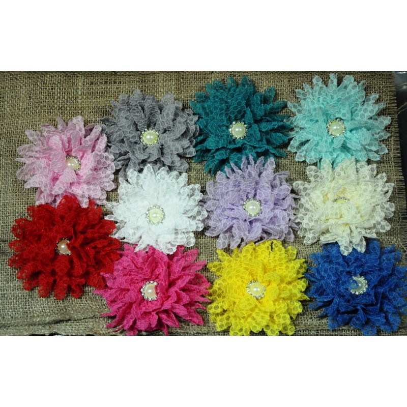 Λουλούδι με πέρλα και στράς απο τούλι στα 10 εκατοστά.σε πολλά χρώματα. τιμή τεμαχίου