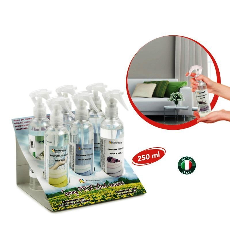 Ιδανικό για το φρεσκάρισμα τζάκετ, καλυμμάτων και κρεβατιού, κουρτινών και χαλιών. οικολογικό κατάλληλο και για αυτοκίνητα.Εξουδετερώνει τις δυσάρεστες οσμές των υφασματων ή της κουζίνας, δίνοντας μία νότα φρεσκάδας και καθαρότητας, χωρίς να λεκιάζει. Διατίθεται σε 6 αρώματα: 01 Λεβάντα, 02 White Musk, 03 Τριαντάφυλλο & βιολέτα, 04 Goccia, 05 Sole, 06 Sea Breeze