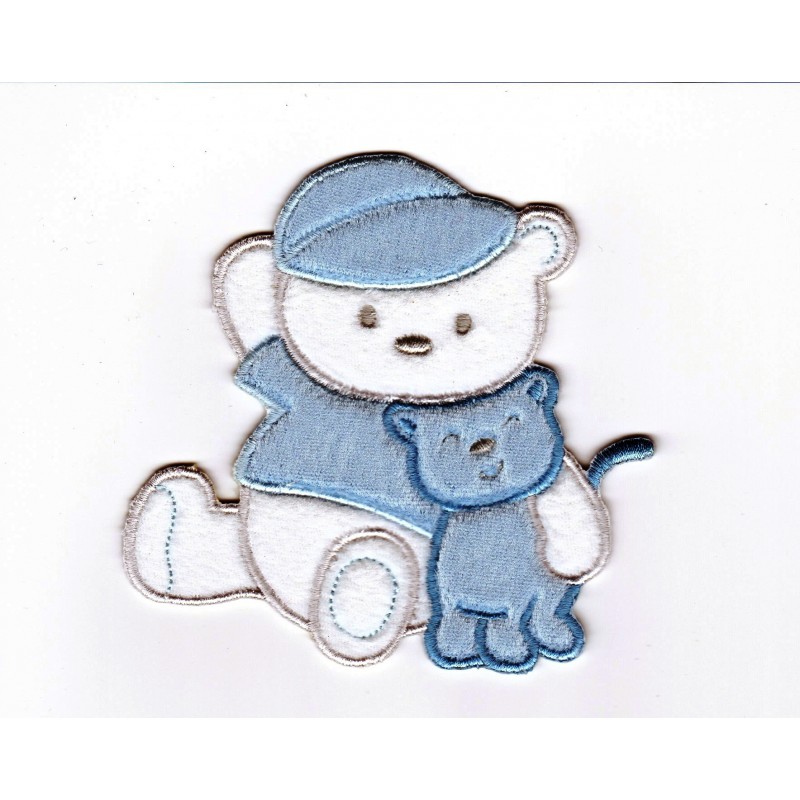 Θερμοκολλητική στάμπα αρκουδάκι με σκυλάκι στην αγγαλιά. Σε χρώμα λευκό με γαλάζιο.