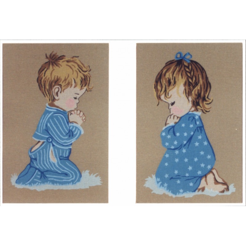Παιδικό καδράκι κεντητό που απεικονίζει ένα αγοράκι και ένα κοριτσάκι με τις πιτζαμούλες τους να προσεύχονται.
