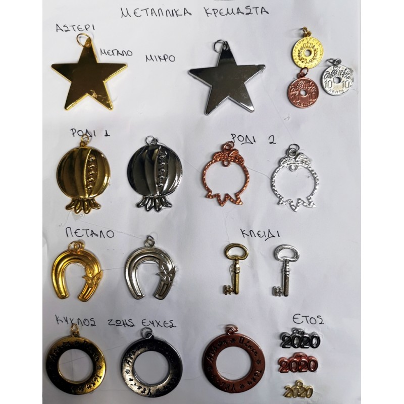 Μεταλλικά στοιχεία σε διάφορα κομψά σχέδια και χρώματα για τη δημιουργία χριστουγεννιάτικων κατασκευών όπως γούρια, κοσμήματα, στολισμό χριστουγεννιάτικου δέντρου και άλλων αντικειμένων, τιμή τεμαχιίου.