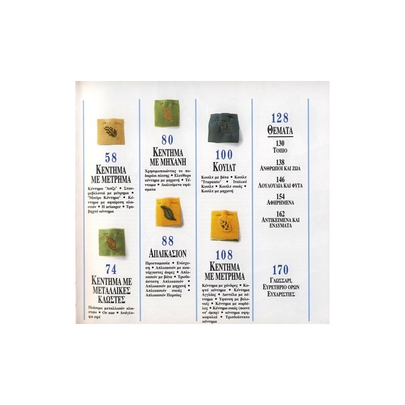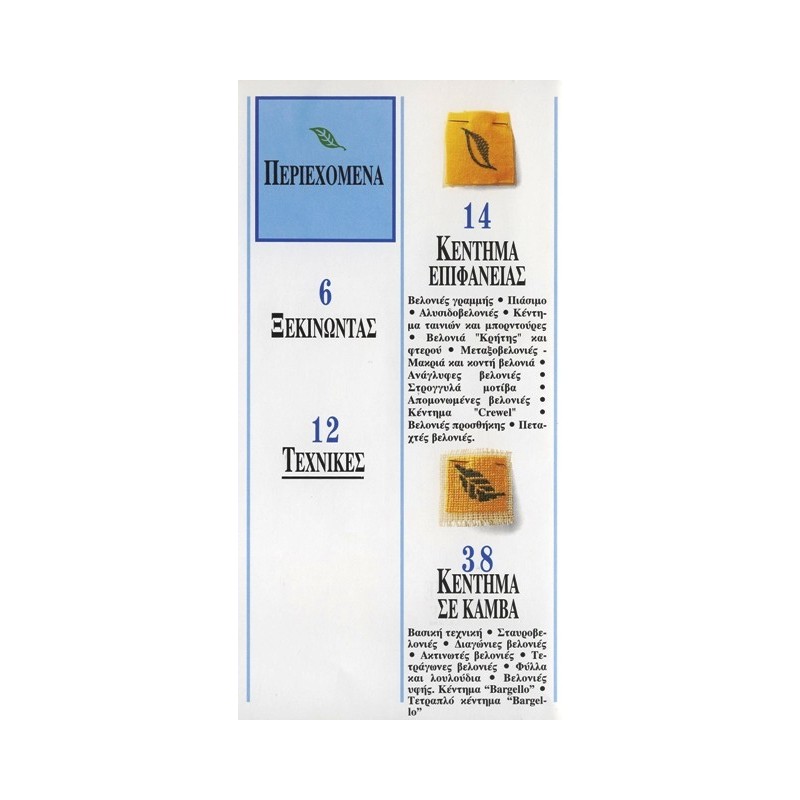 Ένας μοναδικός εικονογραφημένος οδηγός των σημαντικότερων τεχνικών κεντήματος με εμπνευσμένα παραδείγματα παραδοσιακών και μοντέρνων έτοιμων κεντημάτων. Από κέντημα απλό, με χάντρες, παρουσίαση υλικών, ανάμικτες βελονιές και πολλά άλλα. Σελίδες 176